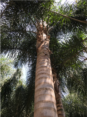 Pertenece a la familia Arecaceae (W. filifera), con tronco robusto, esbelto y simple, engrosado en la base, revestido por los restos de las hojas ya secas que forman un característico aditamento, aunque desaparece con el tiempo.